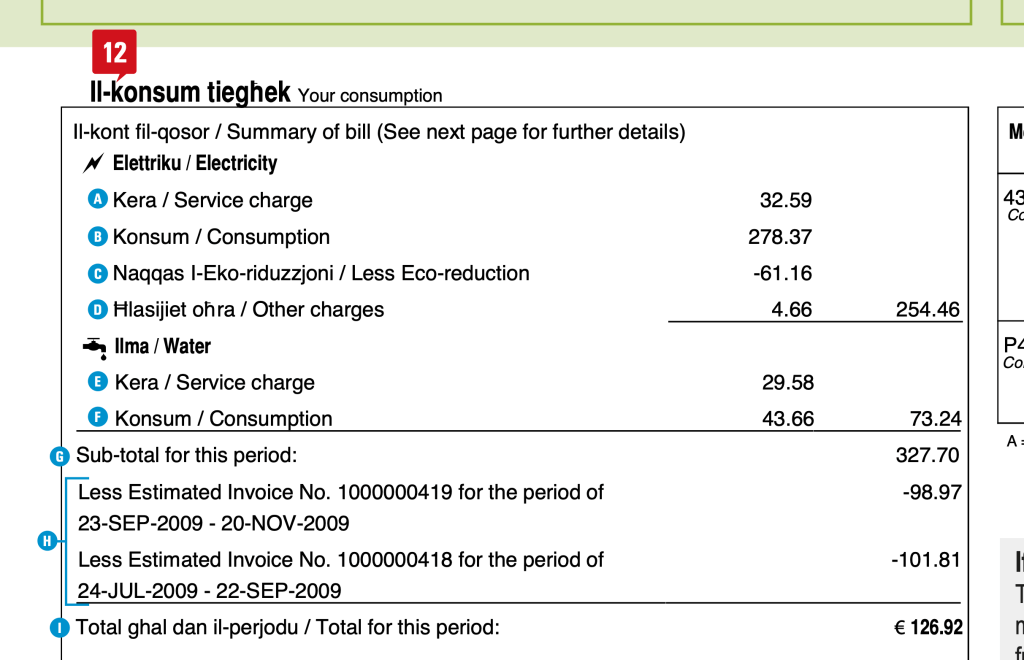 - H. If this bill is based on actual readings, or if it is a half yearly bill, then previous estimated bills are subtracted as shown in this section. This section is empty when the bill is issued on estimated readings or when your consumption is read through a Smart Meter.