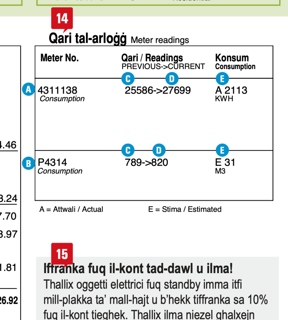 - E. Consumption which is calculated by subtracting (14.C) from (14.D). An A indicates an actual reading (either by the meter reader or through a smart meter). An E indicates an estimated reading.